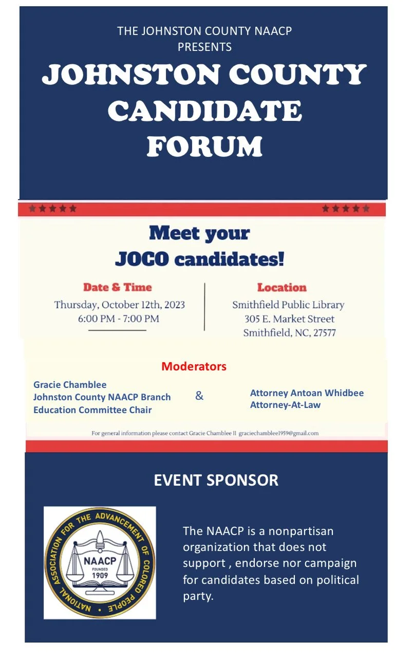 Please come out for the Johnston County Municipal Candidate Forum on October 12th at the Smithfield Public Library from 6pm-7pm. Sponsored by NAACP .