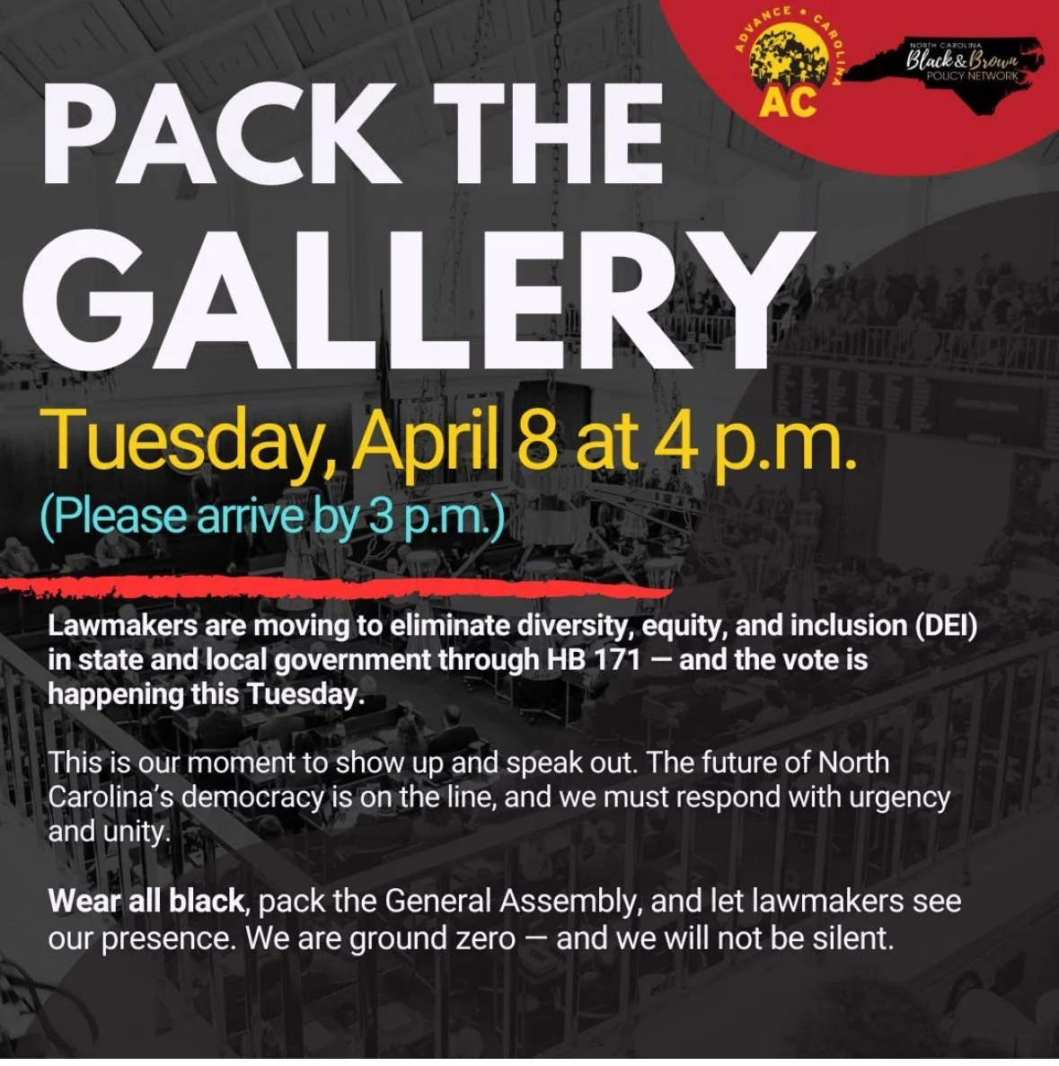 Today, the North Carolina General Assembly will be voting on House Bill 171 , a dangerous bill that seeks to eliminate diversity, equity, and inclusion (DEI) in our state and local government. This is a critical moment, and we cannot afford to remain silent.