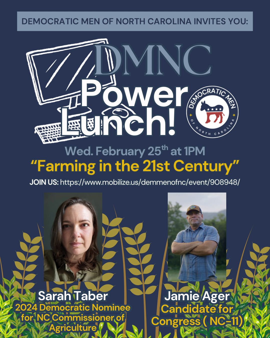 The Democratic Men of North Carolina invites you to join us for a Power Lunch on Farming in the 21st Century. As part of our broader commitment to included as many voices as possible in addressing North Carolina's most pressing issues, we want your voice and your opinions on the realities facing farmers and the changes in how food gets on our tables in the modern era.