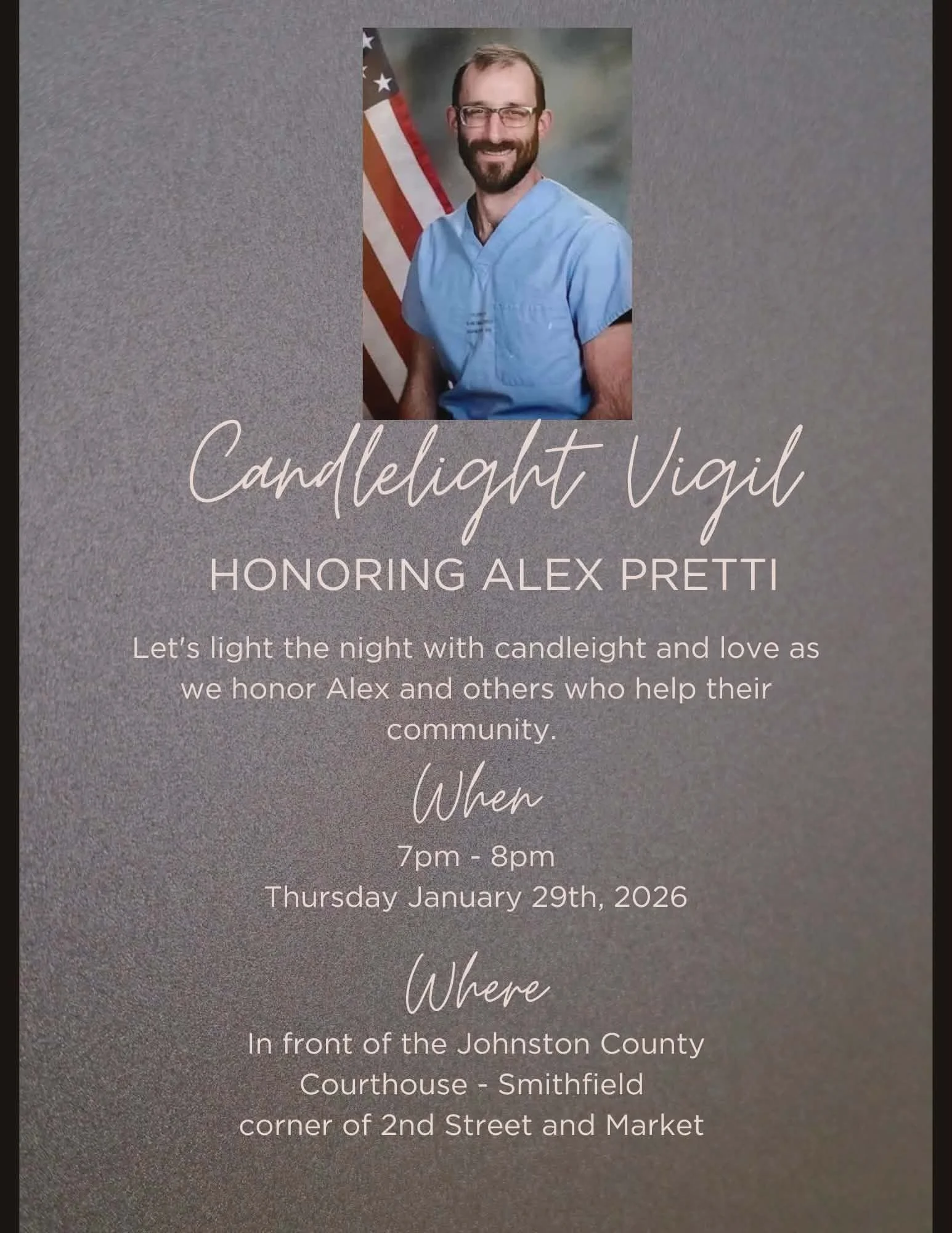 Candlelight Vigil Honoring Alex Pretti Thursday, January 29, 2026 7:00 PM 8:00 PM 19:00 20:00 Johnston Co Courthouse Market St & Second St Smithfield United States (map) Google Calendar ICS